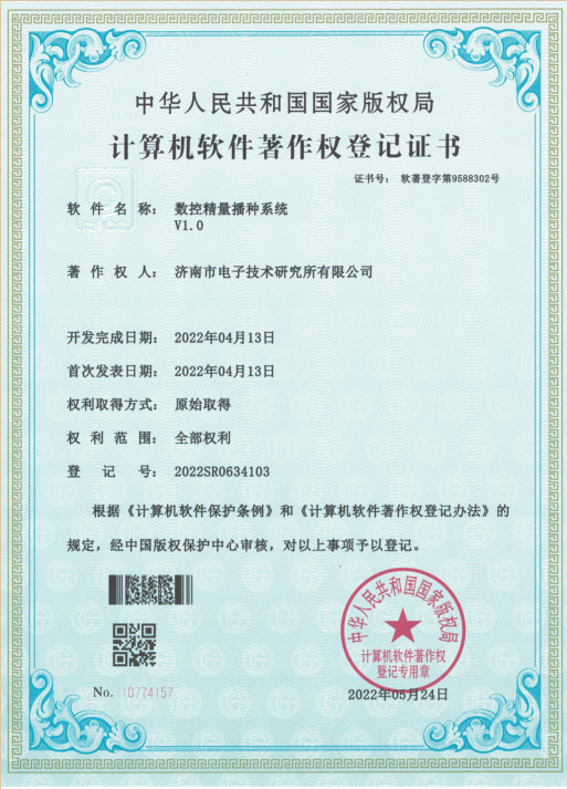 2022年5月23日,5月24日,我公司JDS-元素大屏显示系统,数控精量播种系统两个软件收到软件著作权证书。