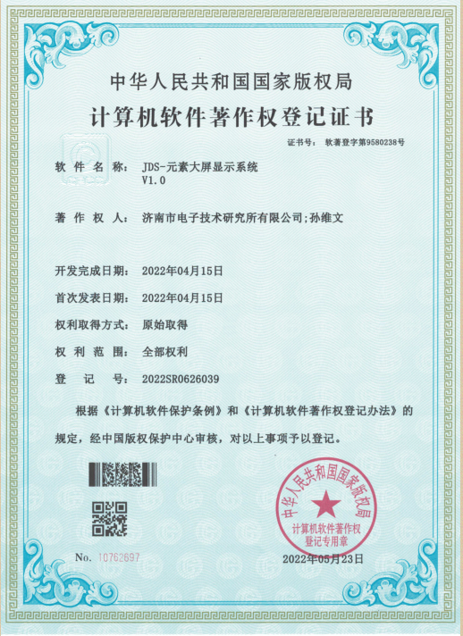 我公司JDS-元素大屏显示系统,数控精量播种系统两个软件收到软件著作权证书